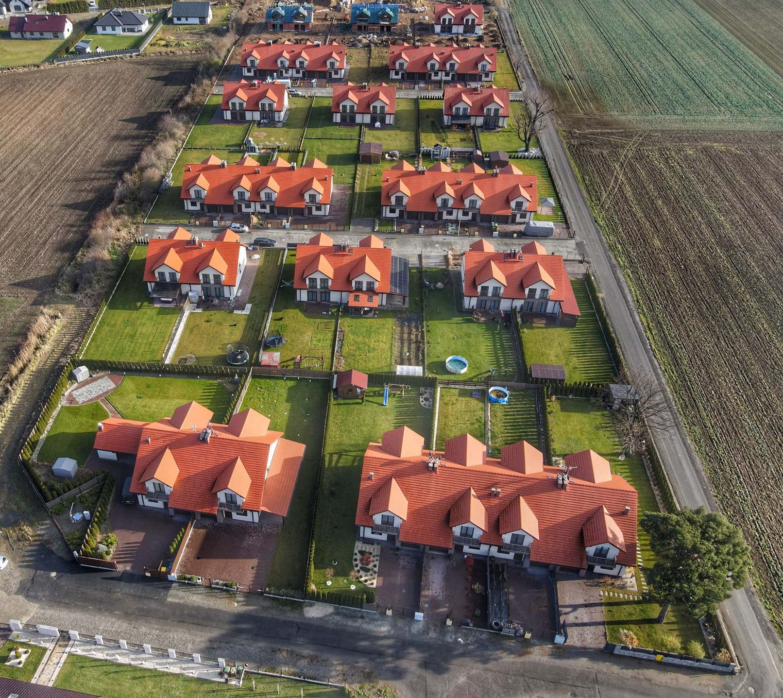 Osiedle z lotu ptaka Posted on 27 listopada 20246 maja 2025 by Adrian Domki w zabudowie bliźniaczej i szeregowej w miejscowości Jaworek. Stan aktualny na dzień 27.11.2024r